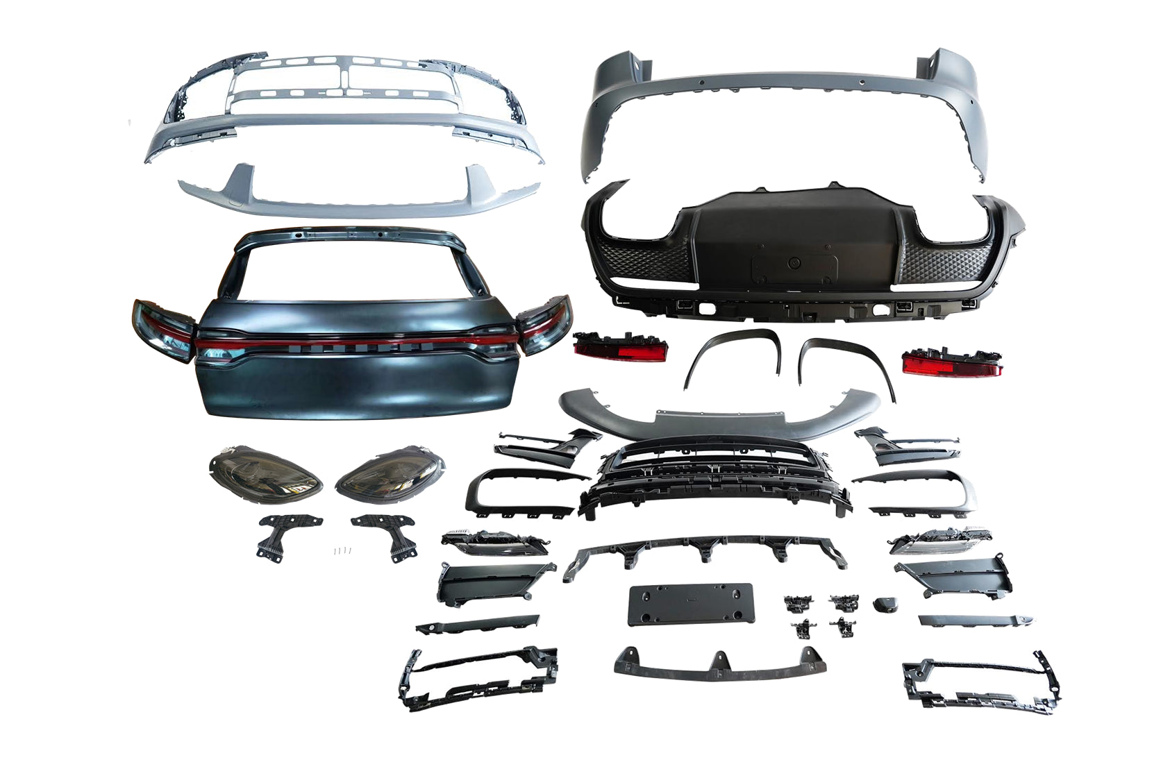 - Sammensat af Bagklap, Forreste kofanger, Bagkofanger, Forlygter, Enderør og Baglygter.
