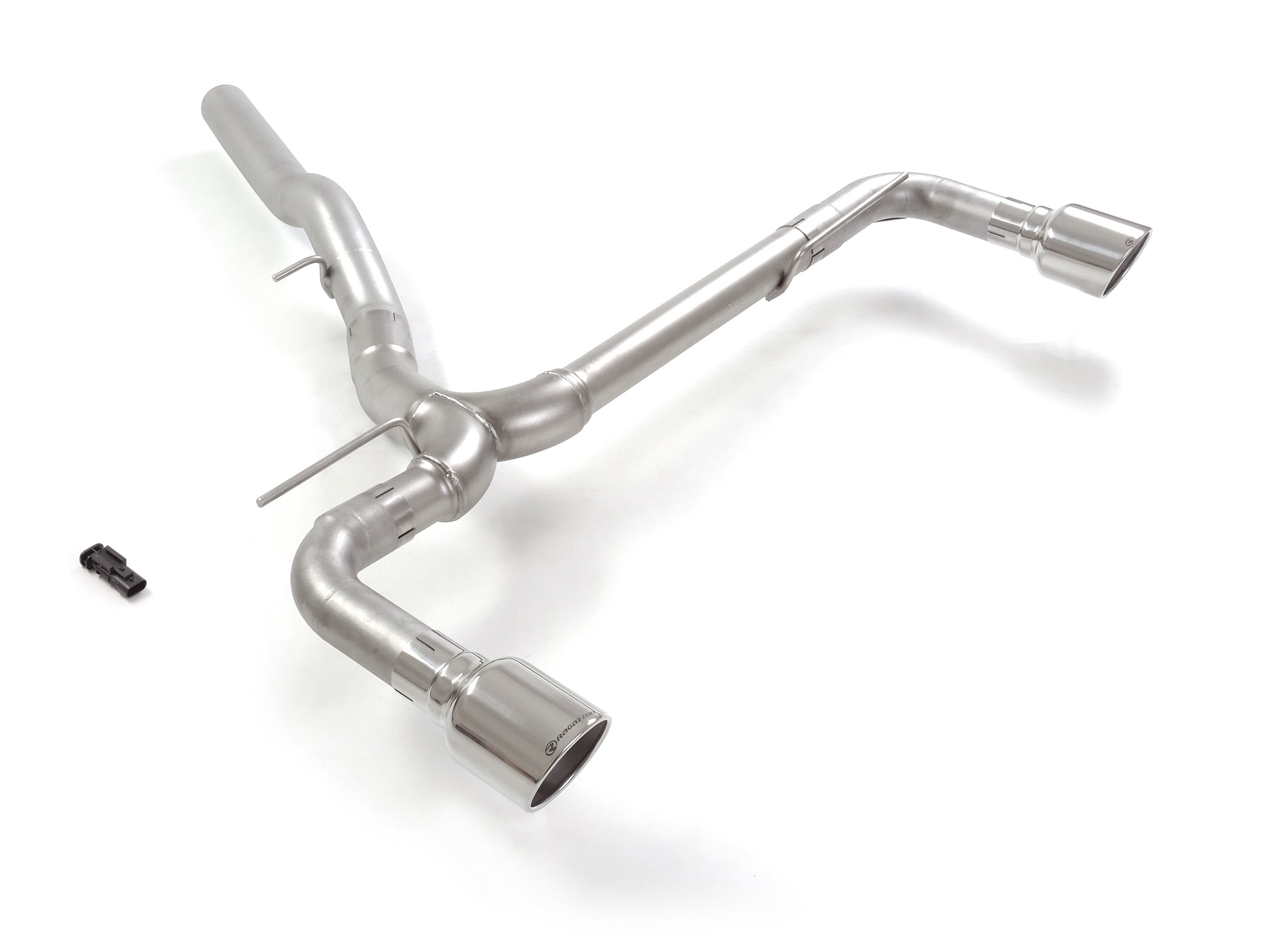 Rustfri stål bagerste rør Gruppe N (Original rørdiameter) venstre/højre hver med runde Sportline enderør 102 mm Uden OEM ventil. Den originale ventilaktuator skal afbrydes fra udstødningen med fastgørelsen af den medfølgende emulator. Oversize